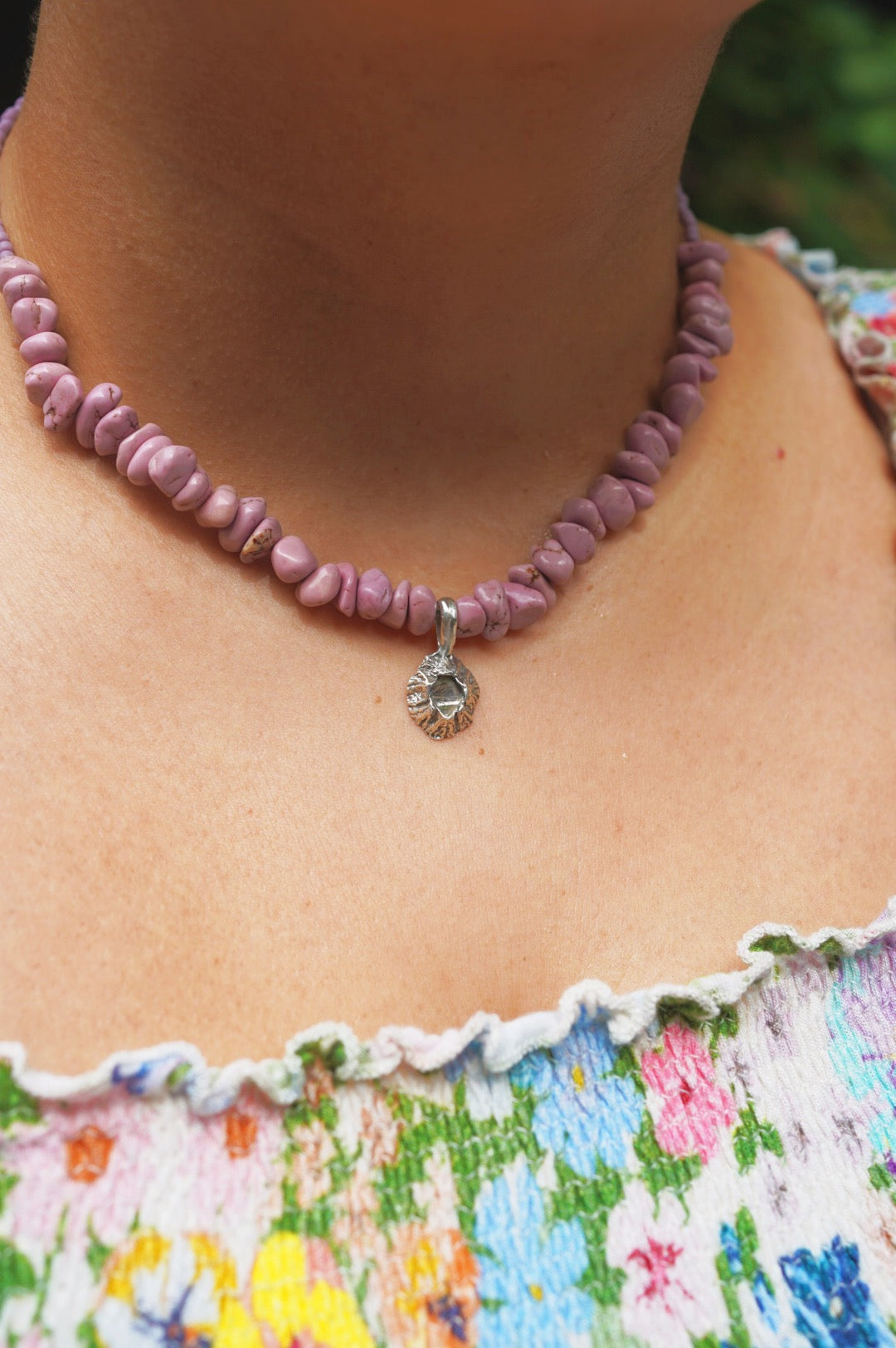 Beaded barnacle charm necklace with rhodonite and seed beads. Has a lobster claw clasp & is 16 inches in length. The barnacle charm was made by me, using a mold of a barnacle that I found on the coast of Maine.