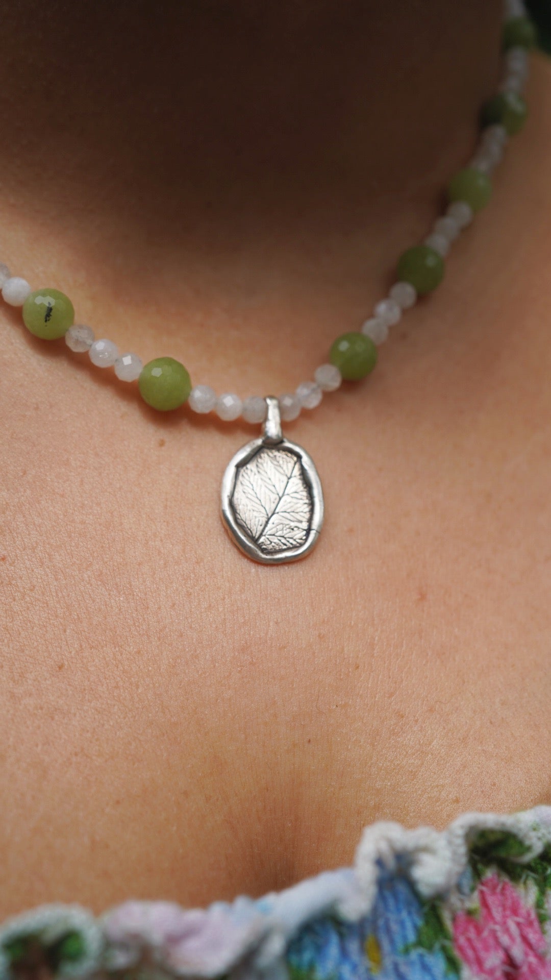 Beaded fern charm necklace with moonstone and green mica beads. Has a lobster claw clasp & is 17 inches in length. The fern charm was made by me, using an impression of a fern leaf that I foraged from my backyard.
