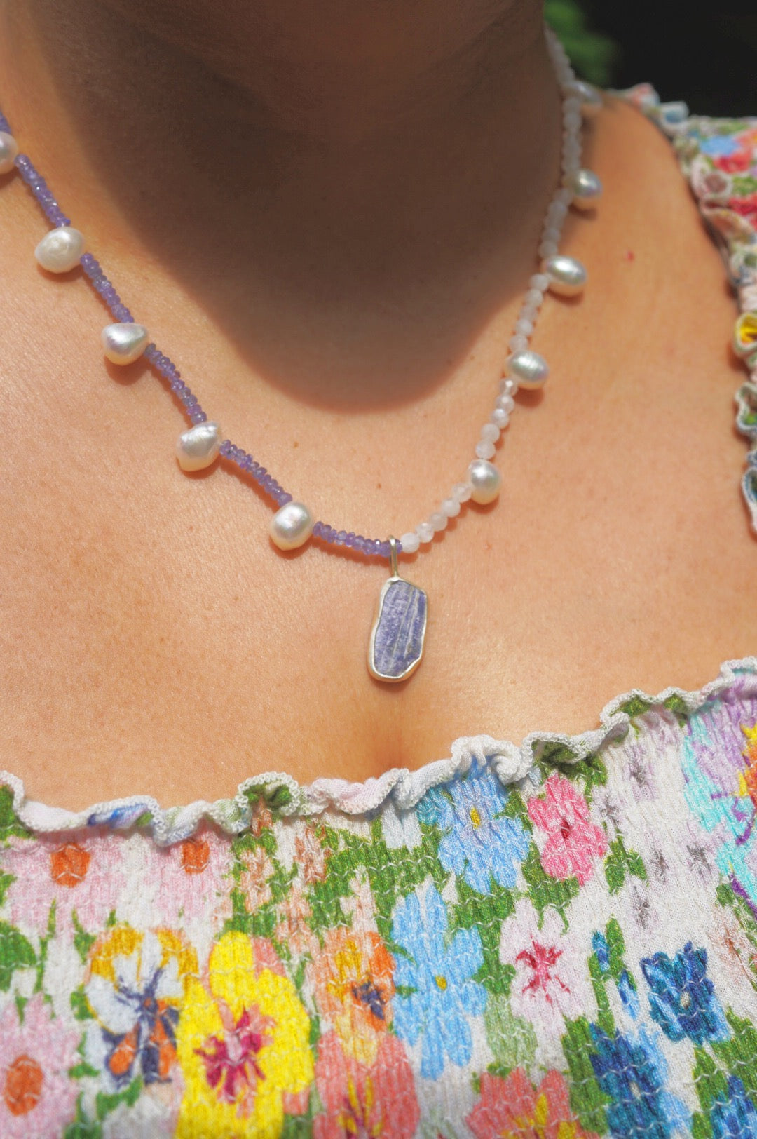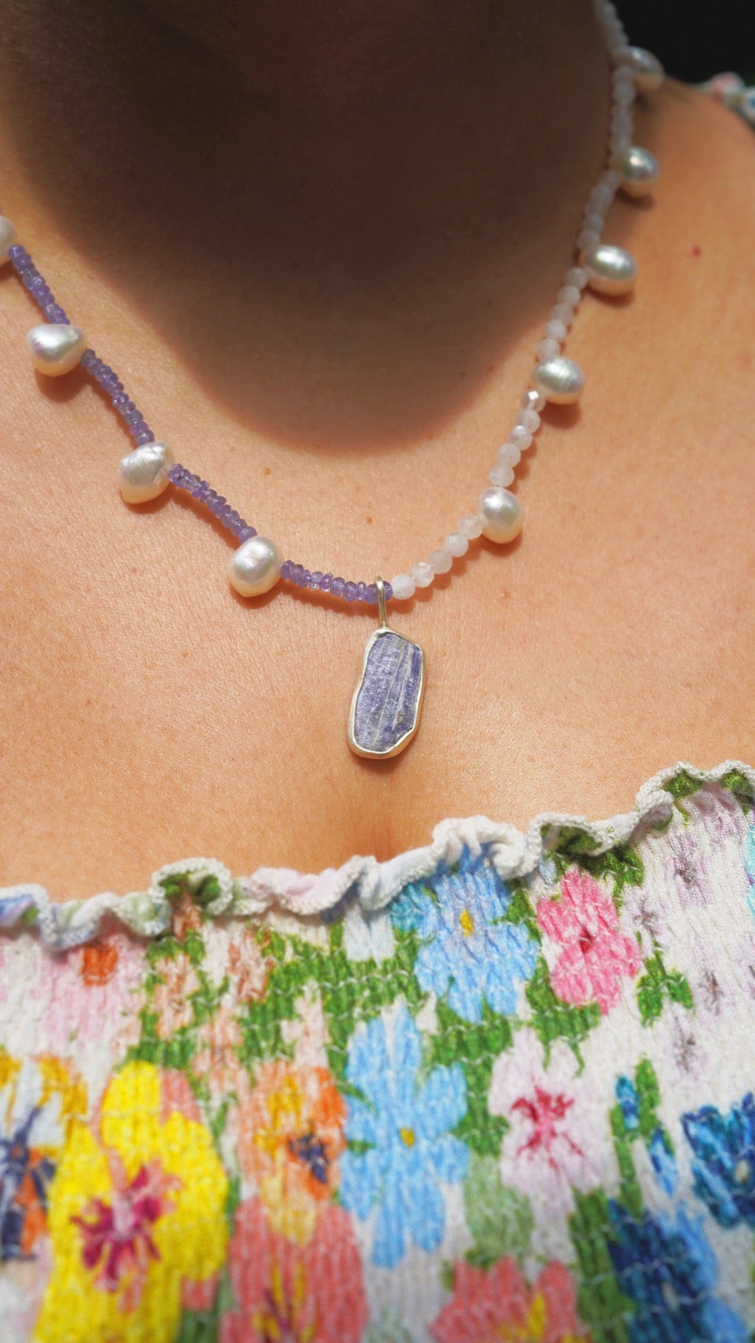 Beaded mussel shell charm necklace with shell pearls, moonstone, and tanzanite beads. Has a lobster claw clasp & is 18 inches in length. The mussel shell was found by me on the coast of Maine, and sanded and shaped into a stone that could be set into sterling silver.