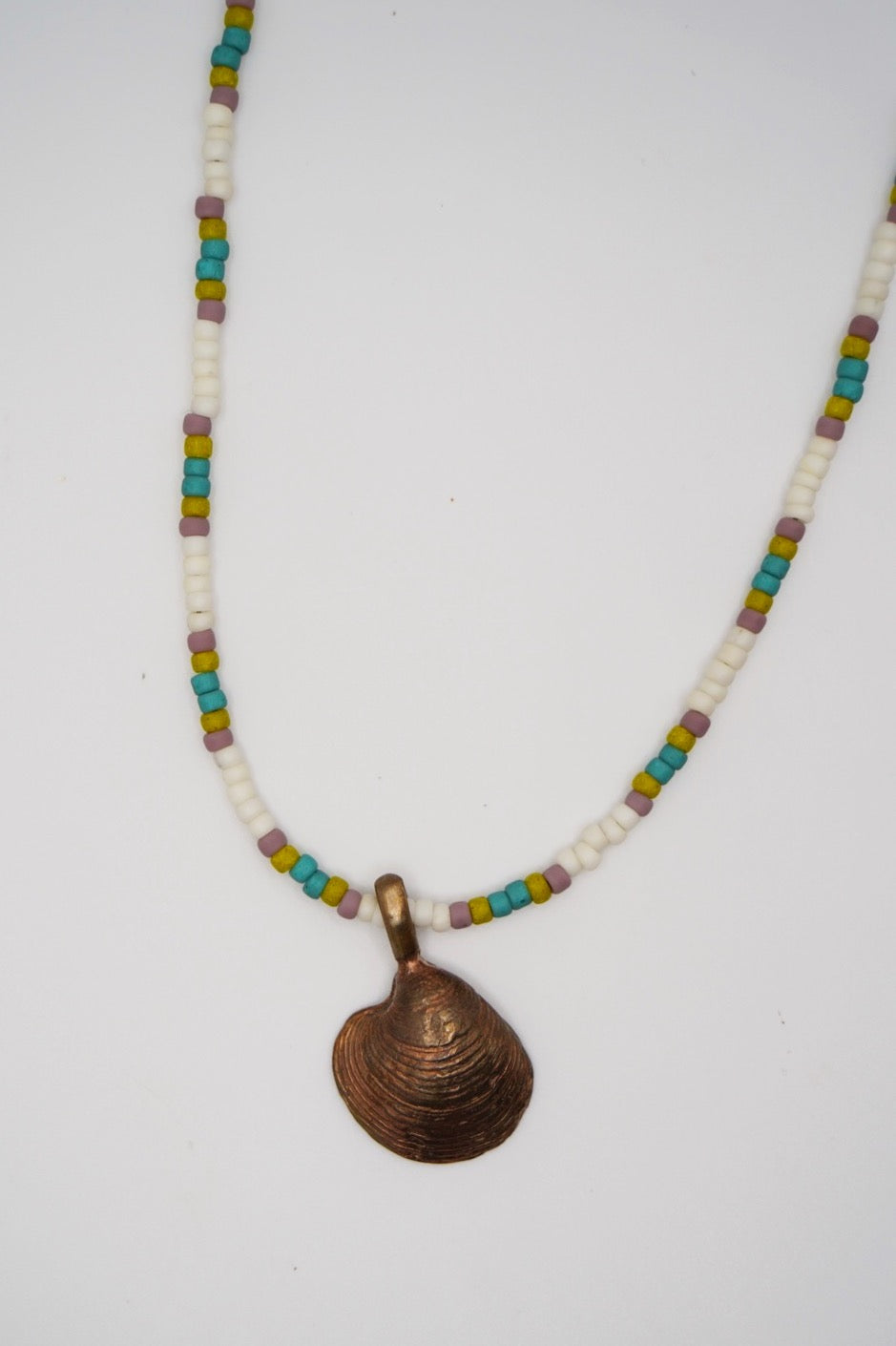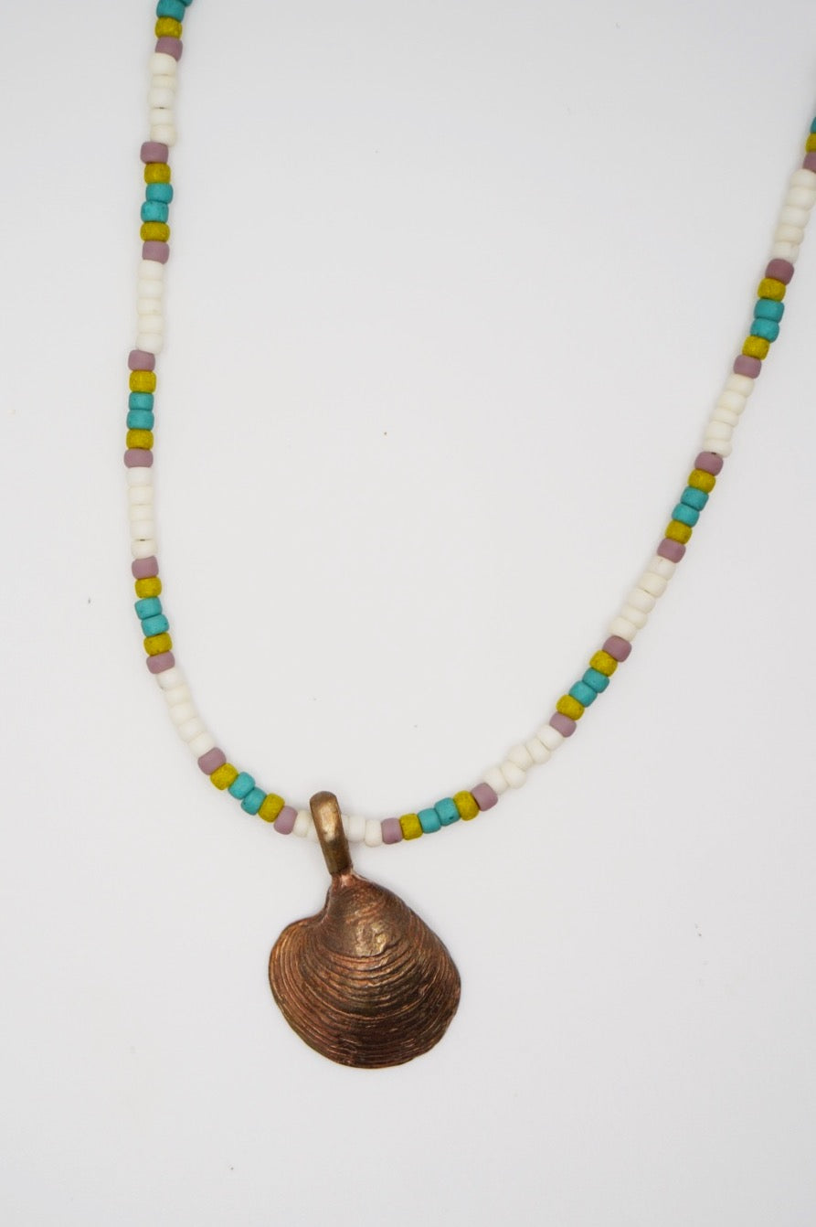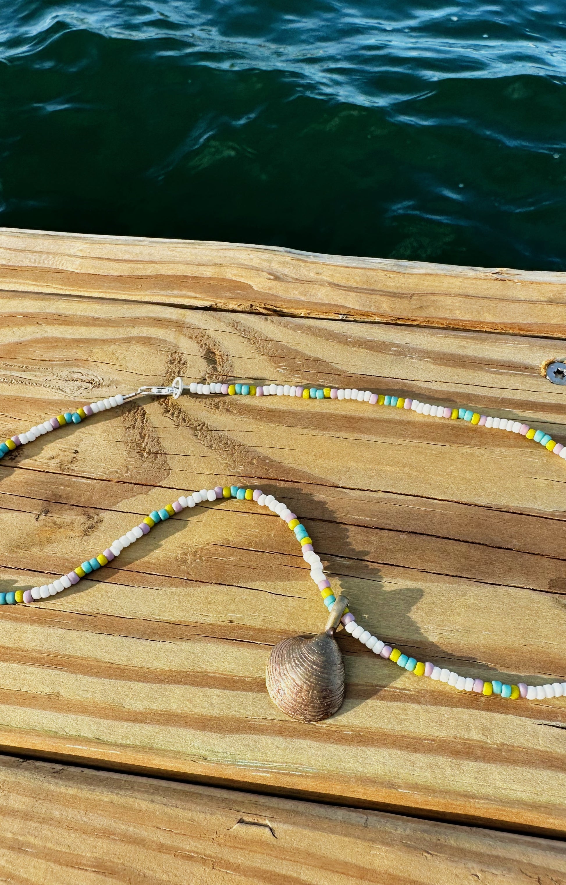 Beaded shell charm necklace with white, green, blue, and purple seed beads. Has a lobster claw clasp & is 18 inches in length. The shell charm was made by me, using a mold of a shell that I found on the coast of Maine.