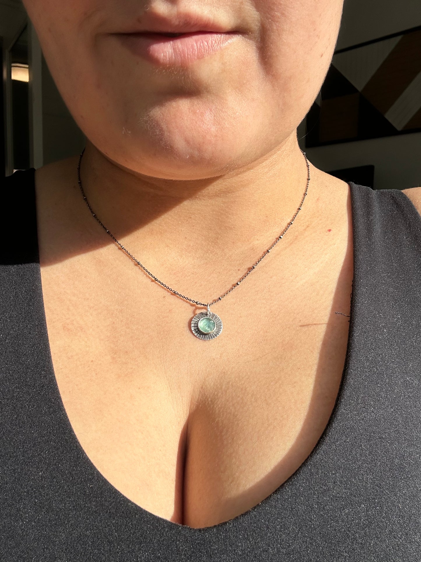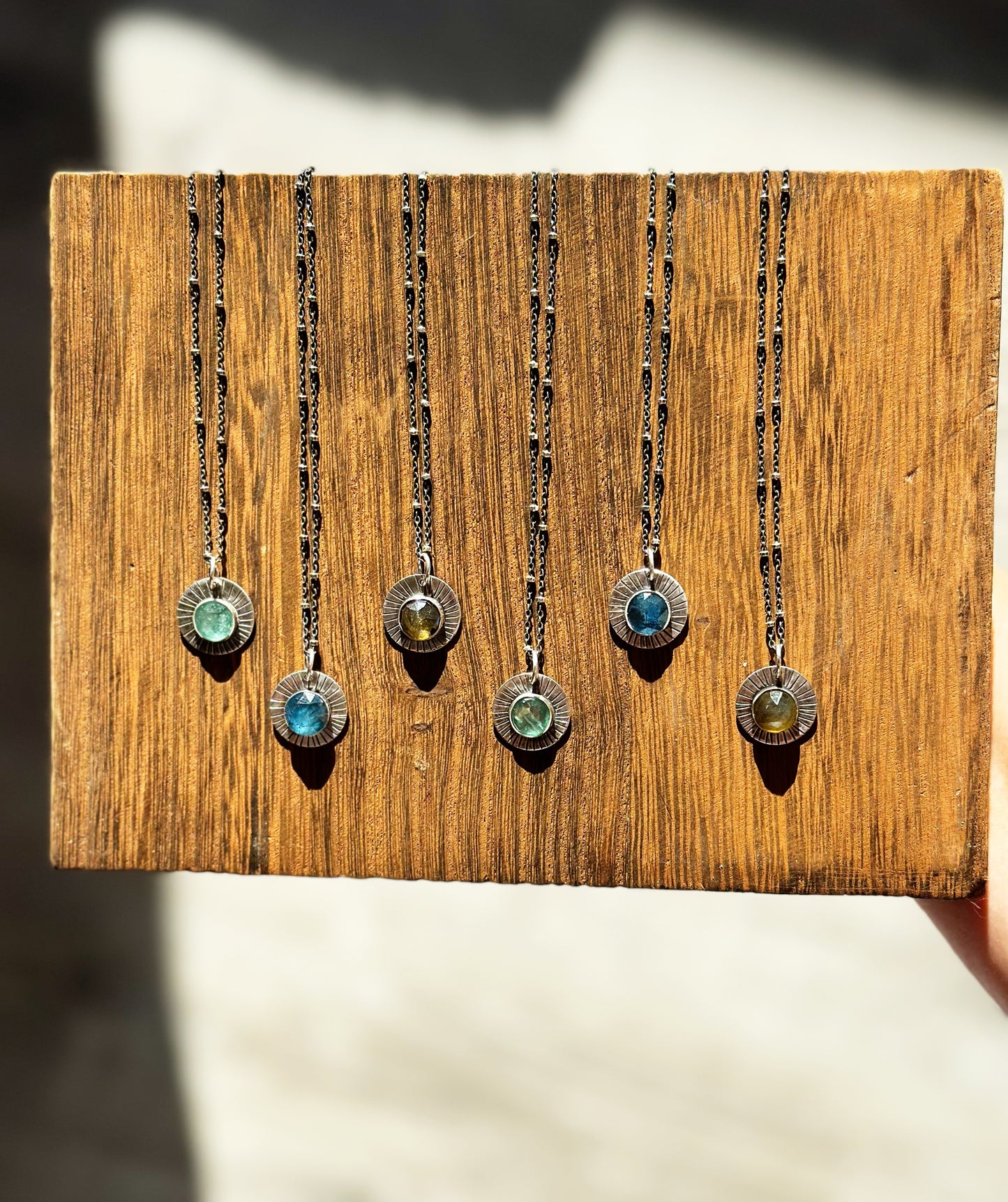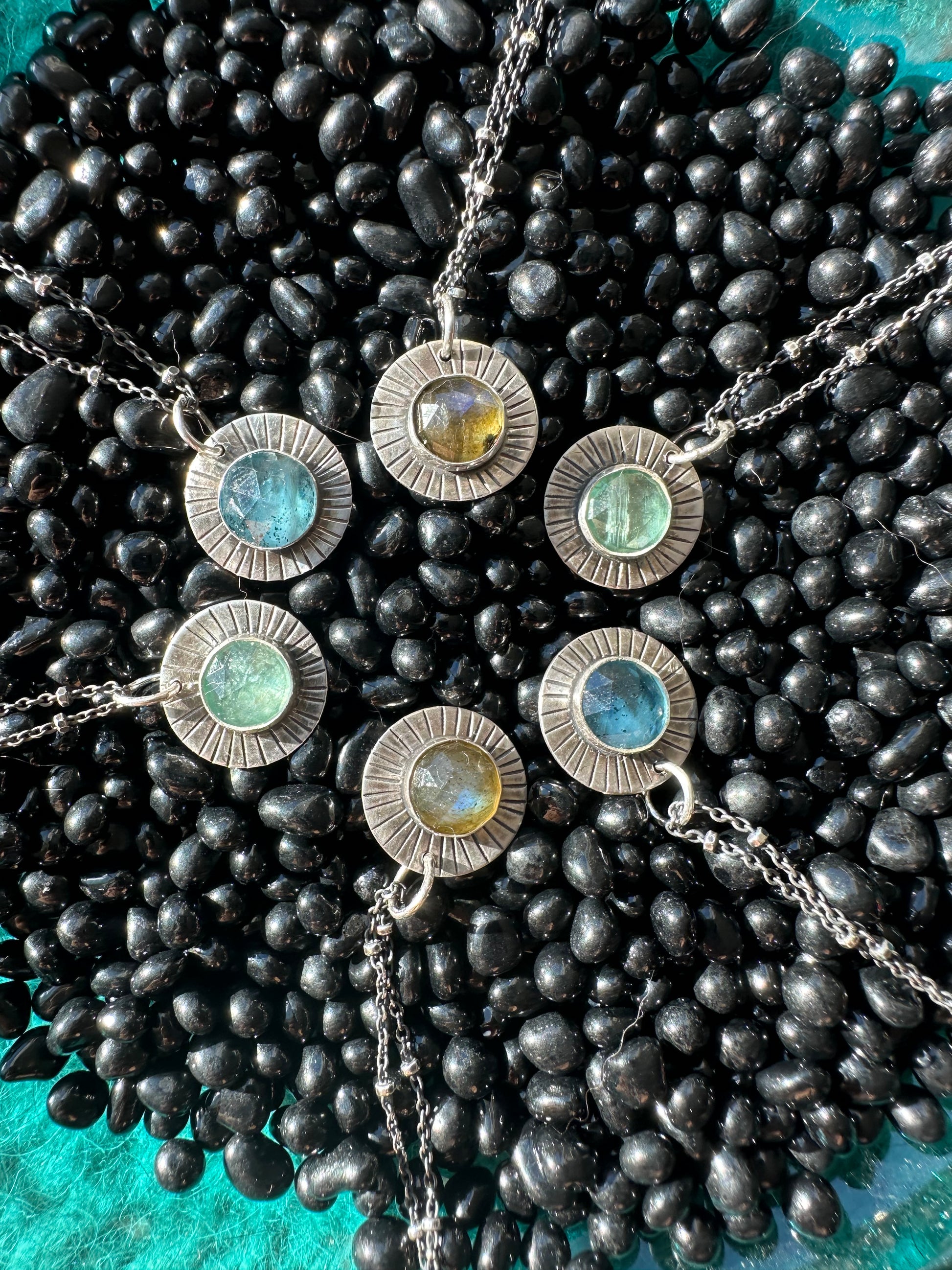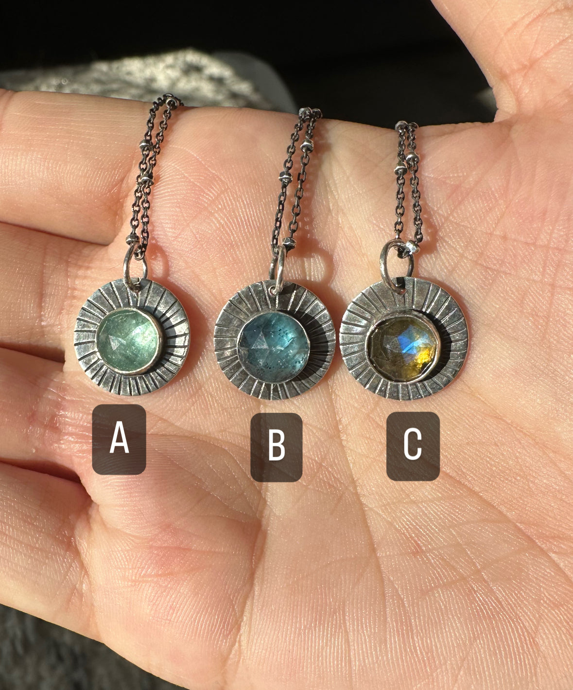 Circle necklaces with a fine line detailing around the sides and a sweet dainty chain. Super lightweight and easy to pair with anything. The letters corresponding to the *second* photo in the listing denote the stone type.