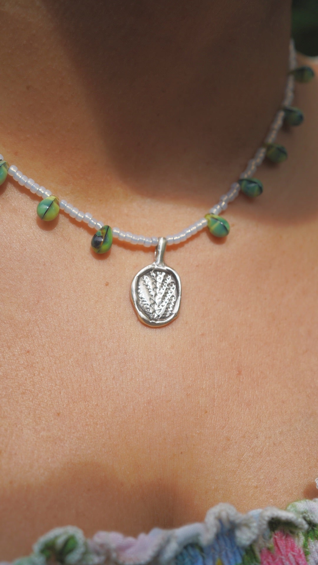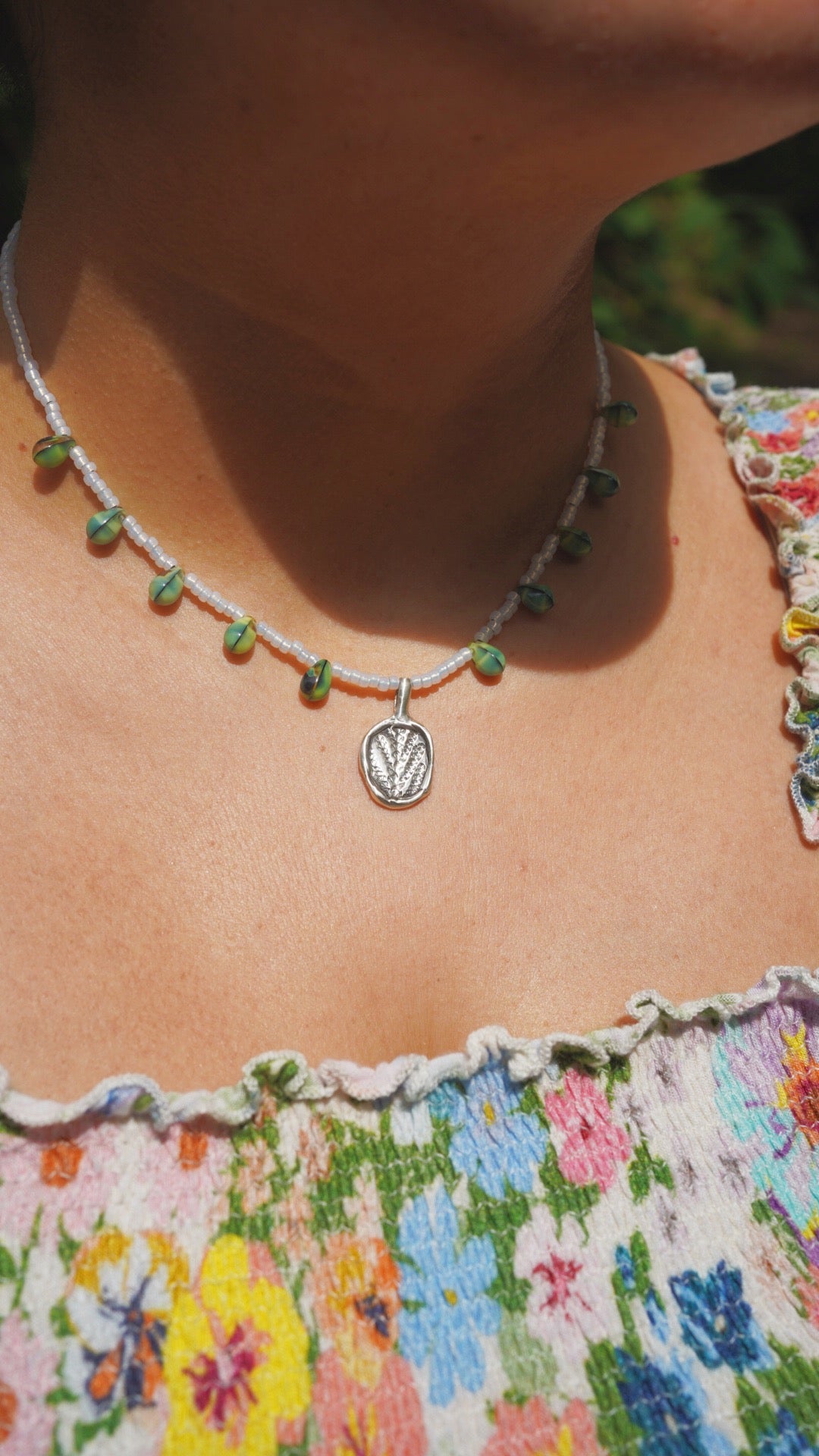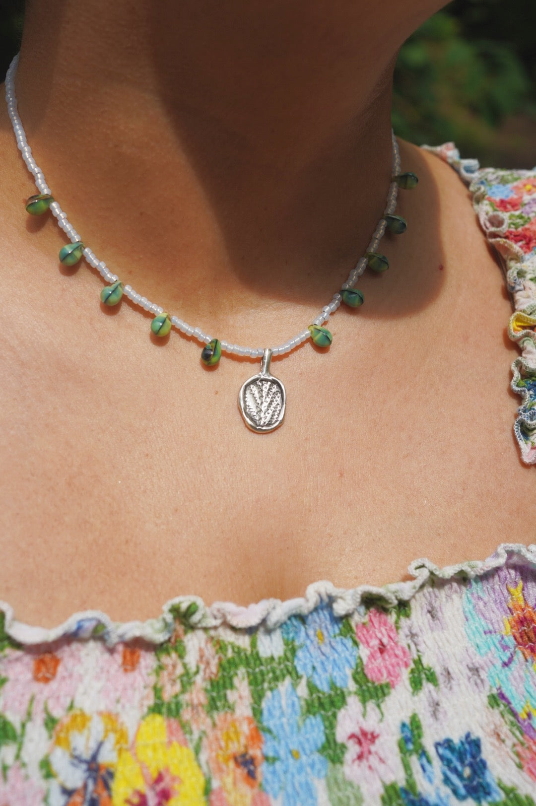 Beaded cedar charm necklace with seed beads and green glass beads. Has a lobster claw clasp & is 16 inches in length. The cedar charm was made by me, using an impression of a cedar leaf that I foraged from my backyard.