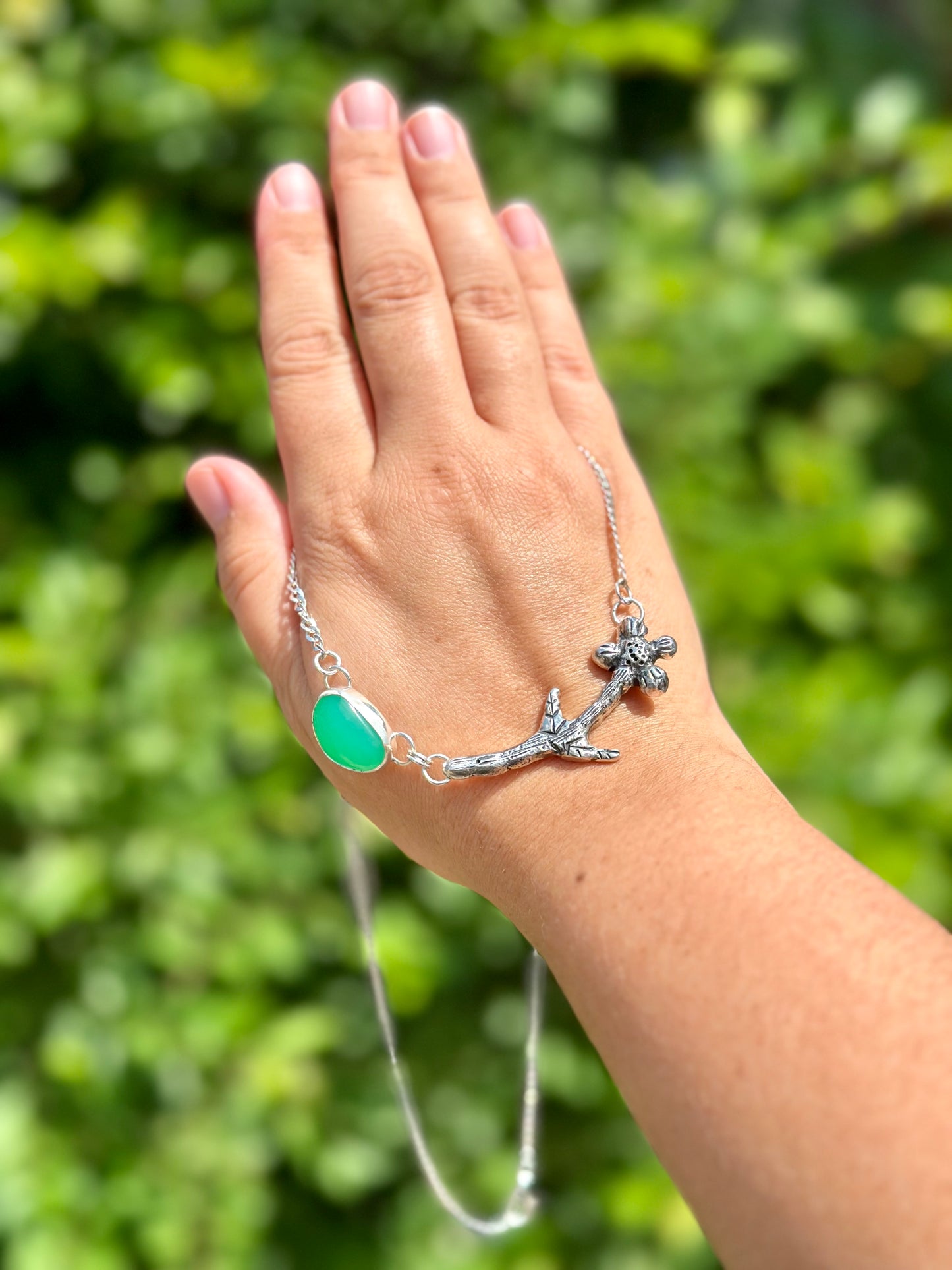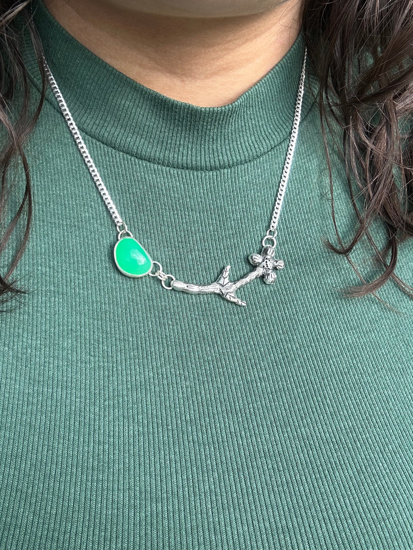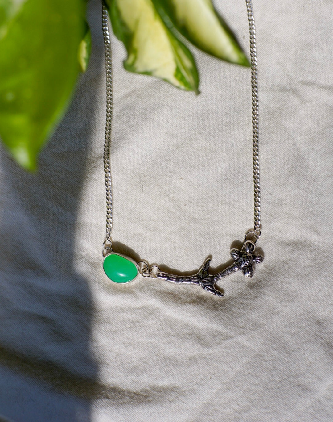 Hand-carved flower necklace made out of recycled sterling silver. The stone is a chalcedony, which I cut myself!