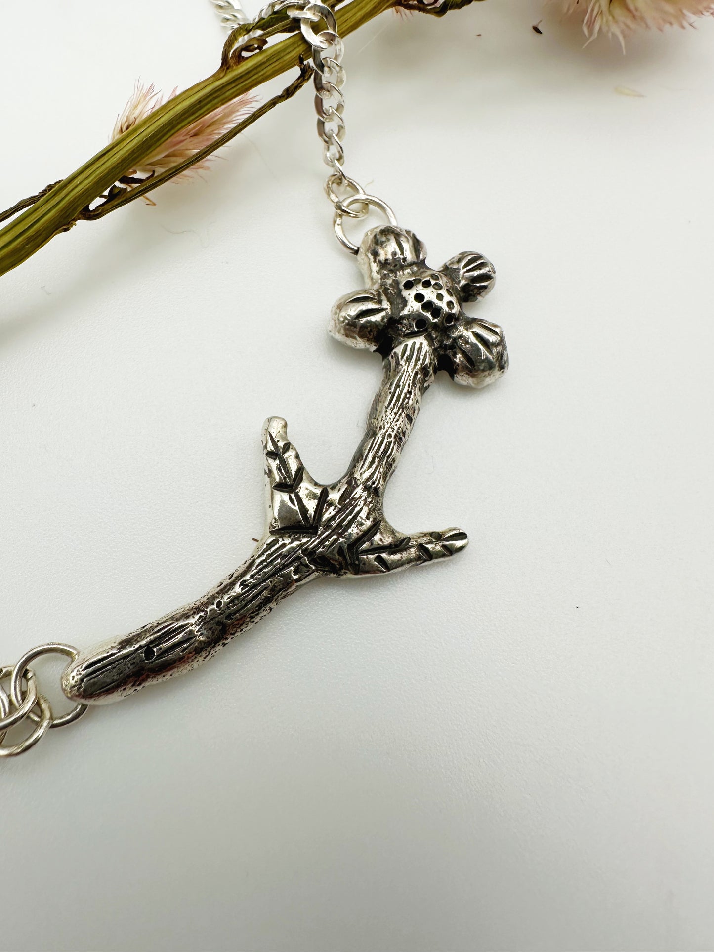 I fused about 20 small balls of sterling silver together and then carved it using a variety of tools to make this flower shape. The stone adds more pretty floral colors to the necklace.