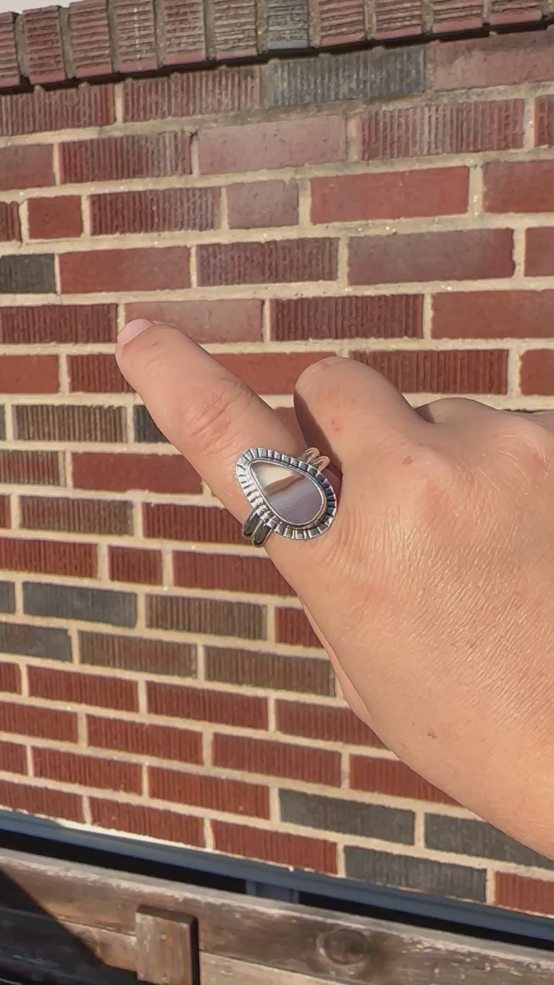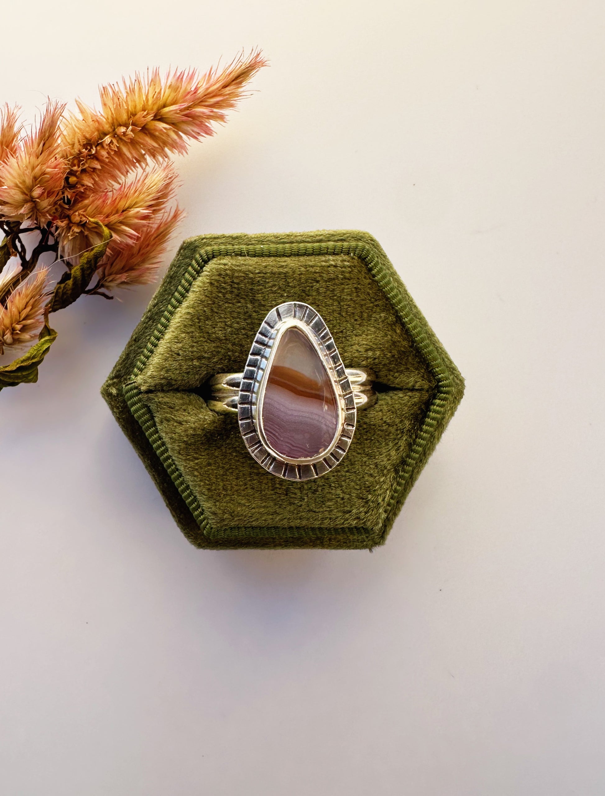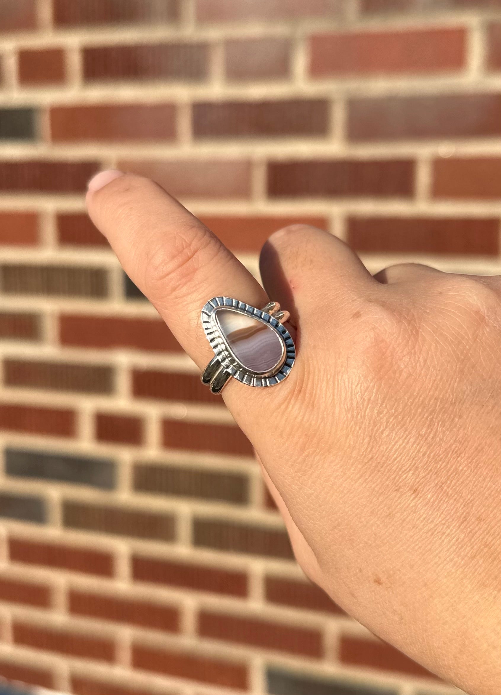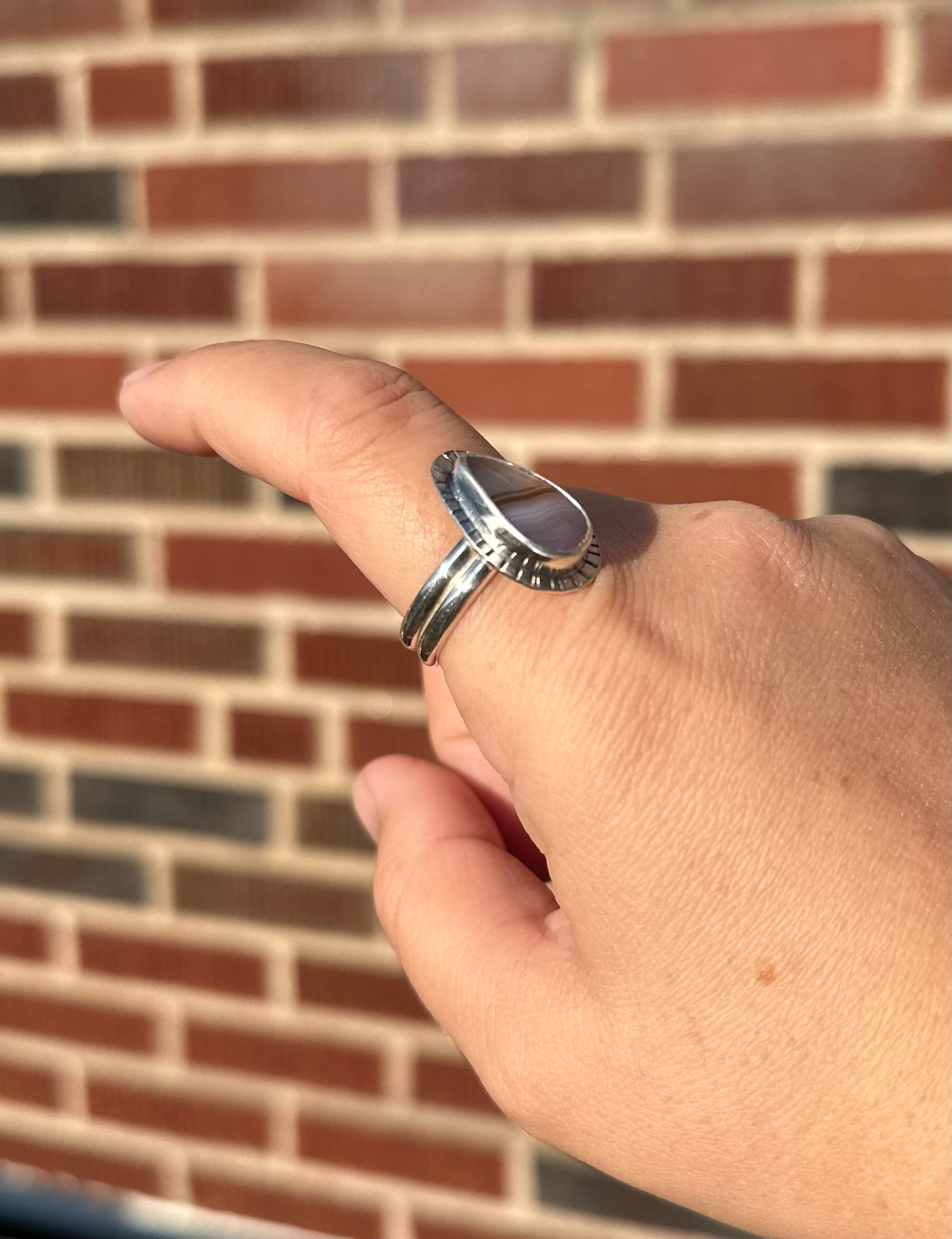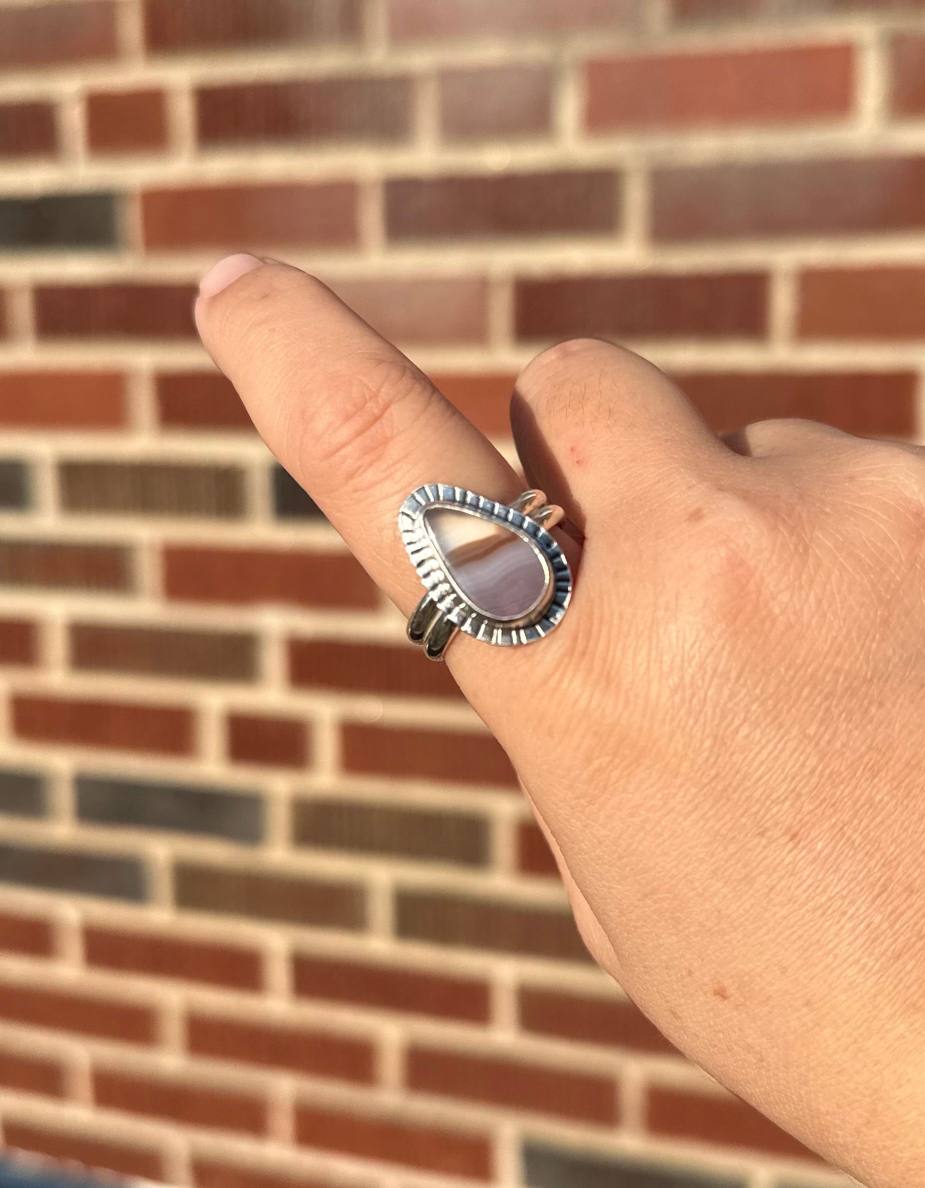 Laguna agate ring with a stamped bezel and a double band. This ring is a size 10. This stone was ethically sourced from a small batch lapidary artist.