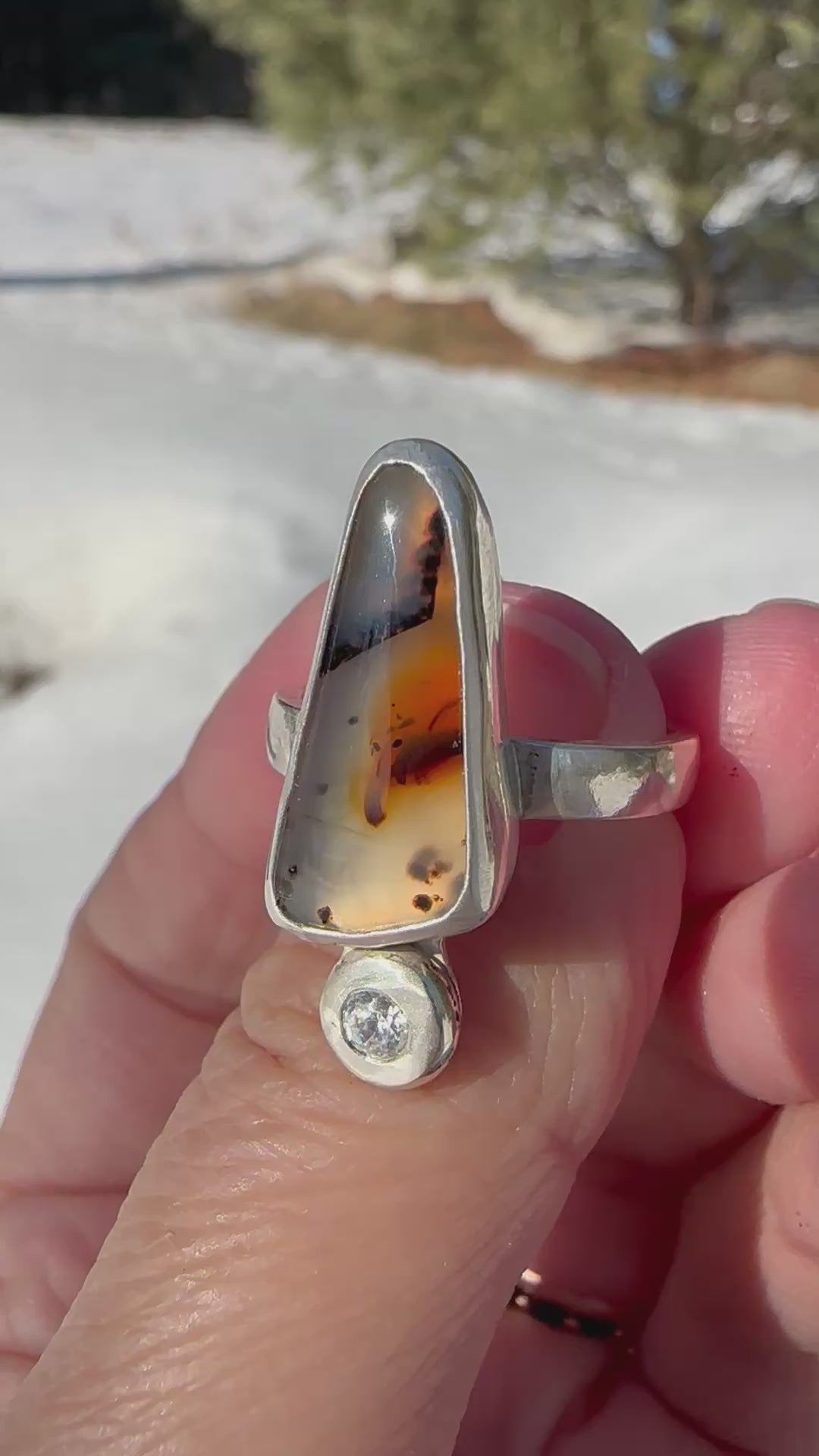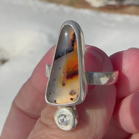 Montana agate ring with a flush set cubic zirconia. This montana agate was responsibly sourced from a small batch lapidary artist, and mined and cut in Montana