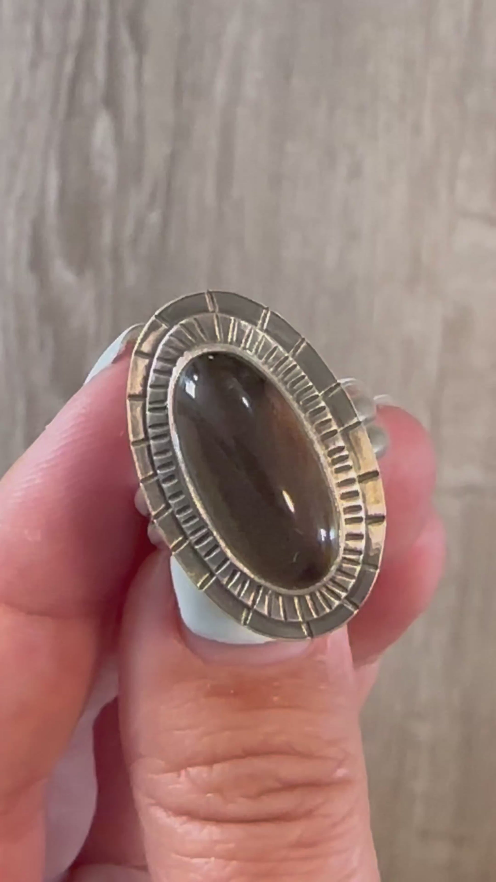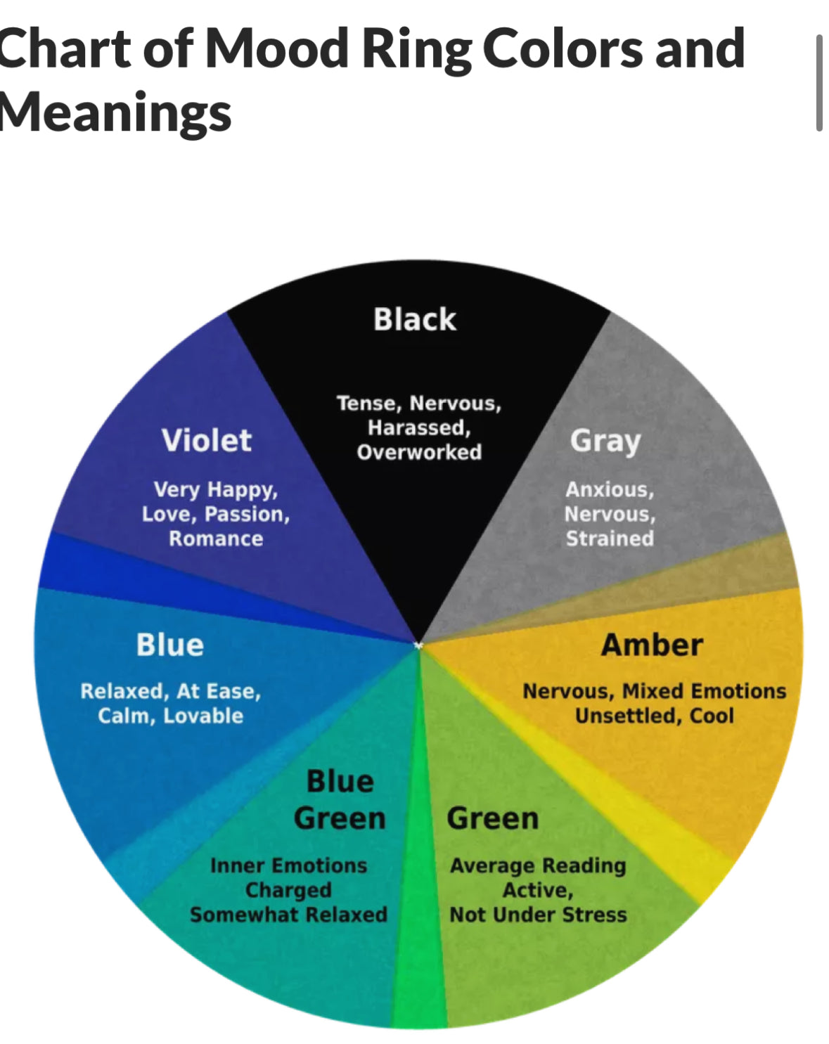 Mood rings made using vintage cabs reclaimed from unworn rings. The stones change color with your body heat, signifying your mood. All come on a double-half-round band.