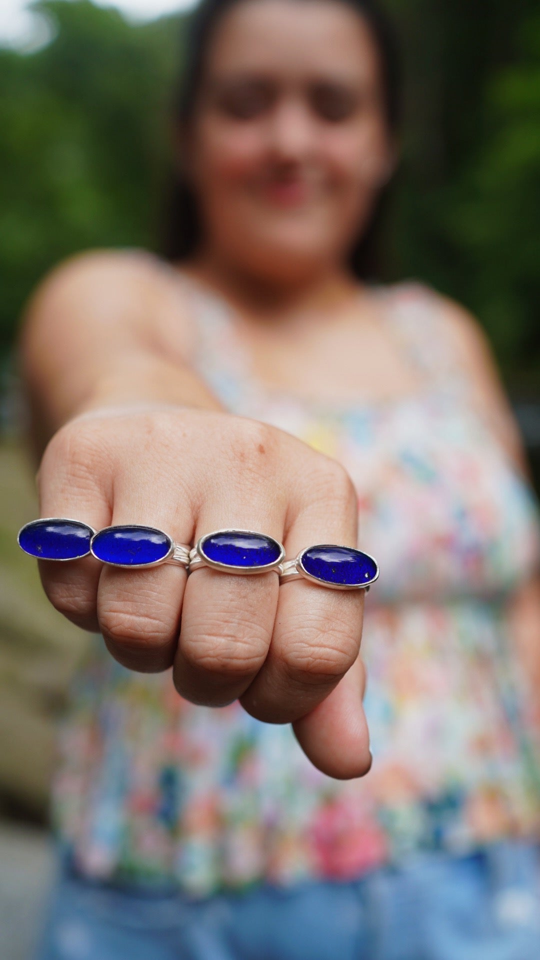 Mood rings made using vintage cabs reclaimed from unworn rings. The stones change color with your body heat, signifying your mood. All come on a double-half-round band.