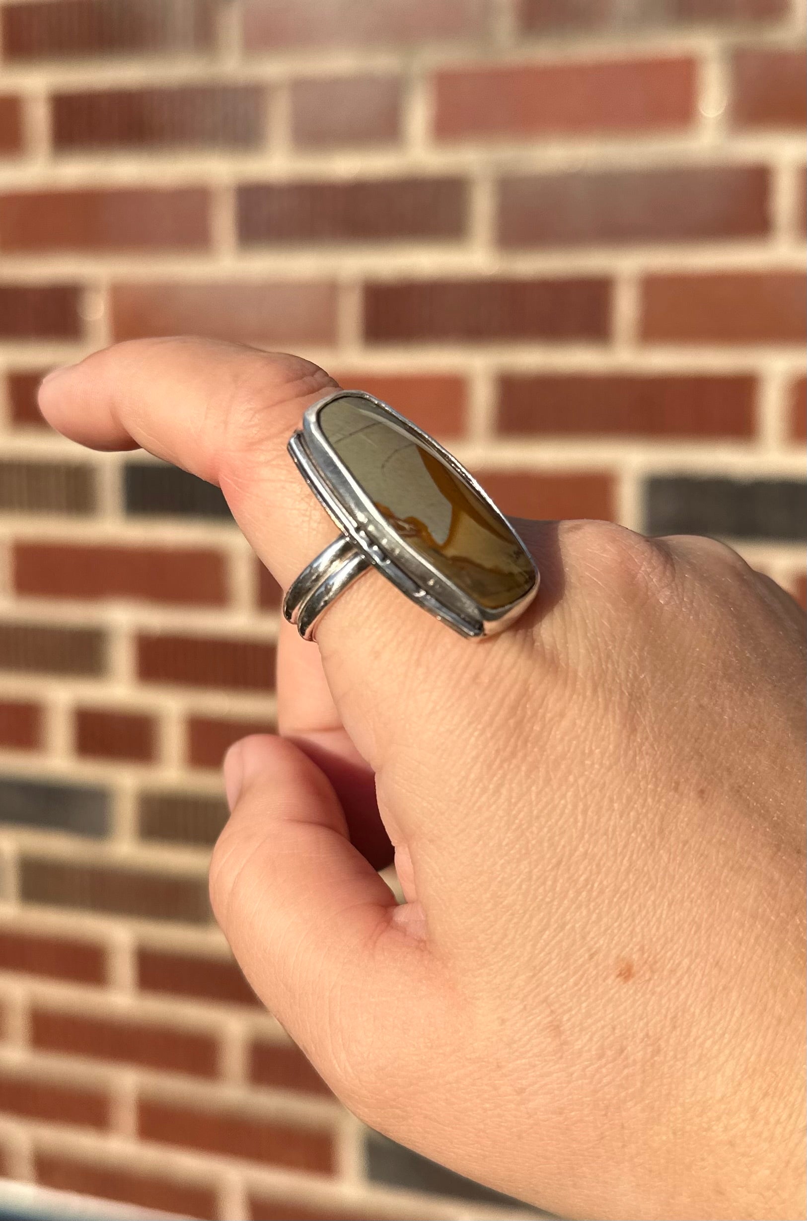 Laguna agate ring with a stamped bezel and a double band. This ring is a size 9. This stone was ethically sourced from a small batch lapidary artist.